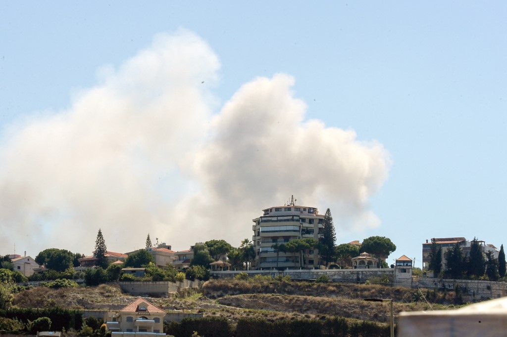 Smoke billows from the site of an Israeli airstrike that targeted the southern Lebanese town of Sarafand, on September 26, 2024. The Israeli military said on September 26 that its fighter jets struck infrastructure on the Syria-Lebanon border used by Hezbollah, as cross-border attacks continued amid calls for a ceasefire. (Photo by Mahmoud ZAYYAT / AFP)