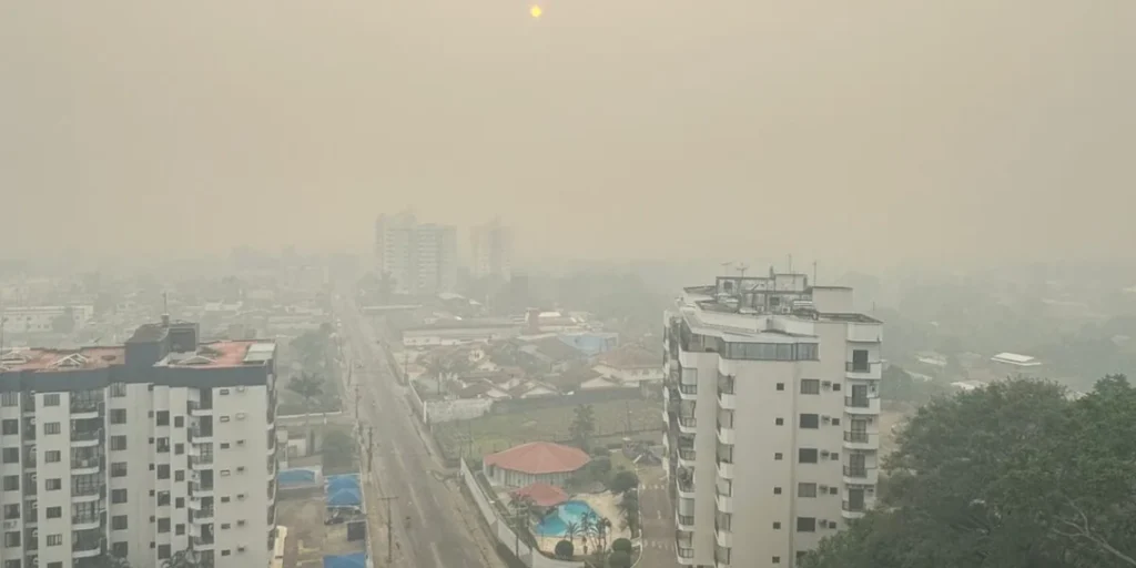 A capital do Acre, Rio Branco, vive mais um dia de poluição extrema, encoberta por uma espessa camada de fumaça resultante das queimadas e da seca intensa que assolam a região.