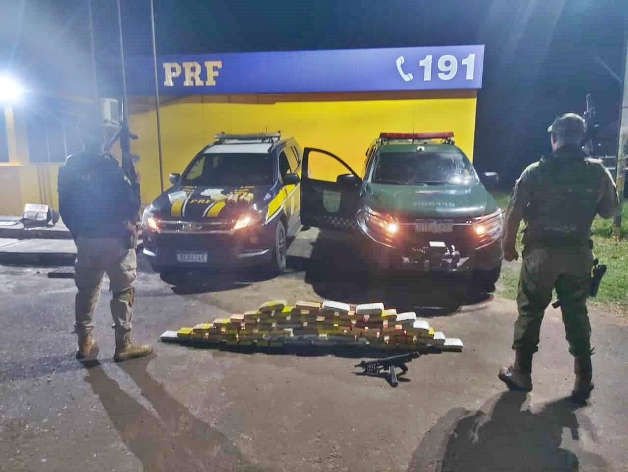 Ação conjunta PM e PRF apreende 55 kg de drogas e submetralhadora na BR-364