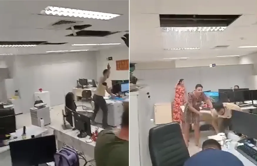 Forro da sede do Iapen desaba durante temporal e assusta servidores; assista