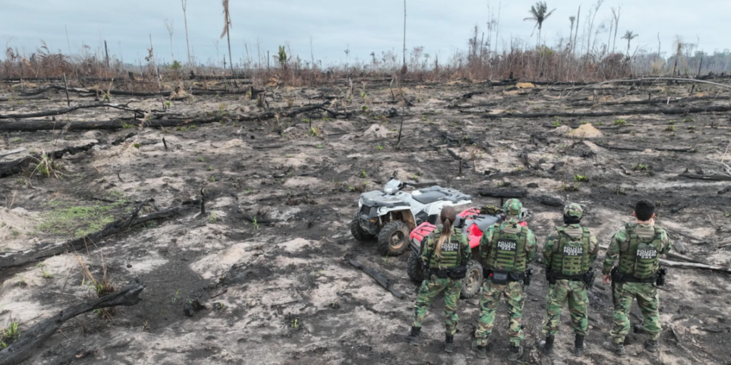 Durante as diligências, os agentes se depararam com uma vasta área recentemente devastada pelo uso de fogo. Foram apreendidas 1.100 cabeças de gado, um veículo automotor e duas armas de fogo, além de outros itens que servirão como provas na investigação.