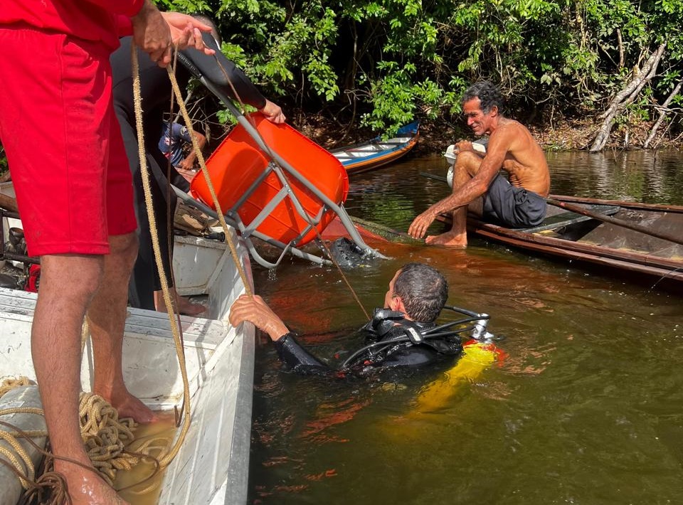 Diante disso, a equipe iniciou os mergulhos e conseguiu localizar o motor bomba, o carro de mão e o motor da embarcação, que foram retirados da água. Esses bens recuperados somam cerca de R$ 4.400,00. Além disso, os materiais que foram totalmente perdidos – 40 sacas de cimento e 3 metros de areia – somam um prejuízo de cerca de R$ 3.050,00.