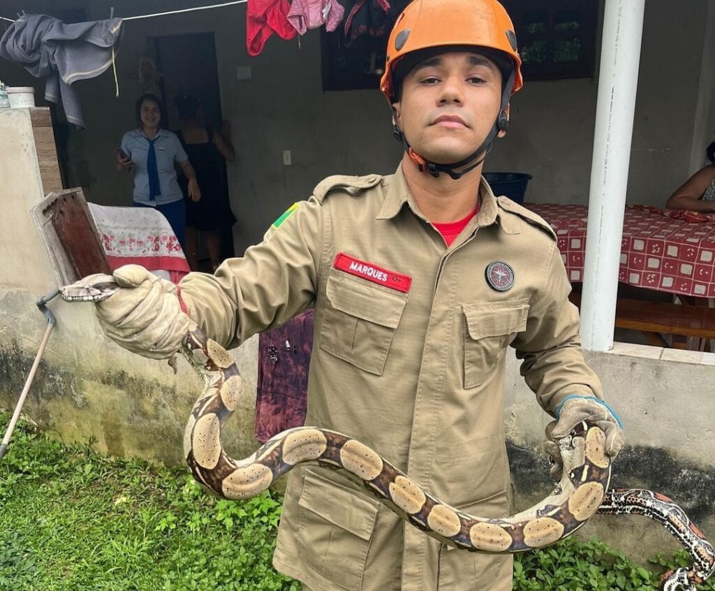 No resgate, os bombeiros precisaram aparar alguns ramos da árvore, a fim de garantir a segurança de todos e facilitar o acesso à cobra. Com o réptil no chão, a equipe utilizou equipamentos especializados, como gancho, pino e tambor, para fazer o manuseio adequado e seguro.