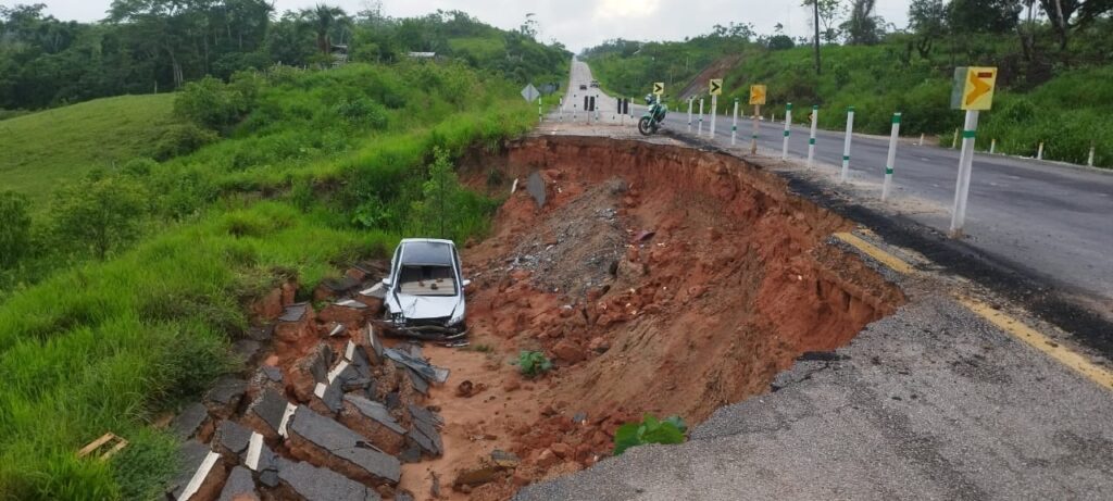 Uma grande erosão vem causando diversos acidentes na BR-364, próximo à Comunidade Taquari, em Tarauacá. Diante disso, para solucionar o problema, quebra-molas serão instalados no trecho a fim de que os condutores mantenham a velocidade moderada e não caiam na erosão, que é bastante profunda.