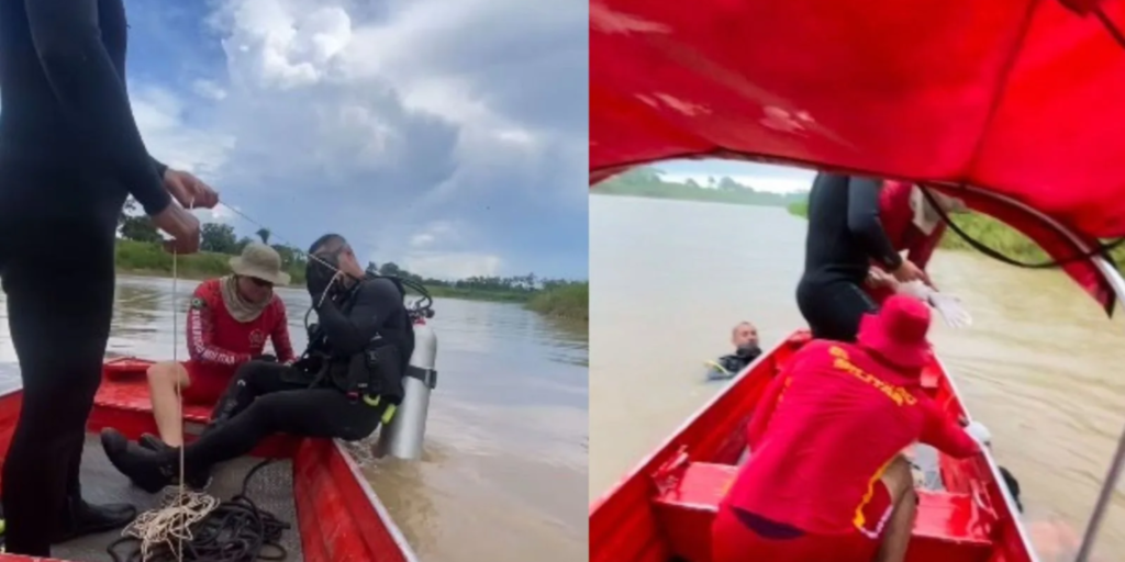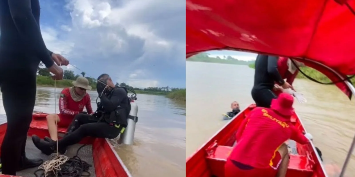Nos stories, é possível ver um bombeiro mergulhador entrando nas águas do Rio Envira, em Feijó; depois, é possível verificar que o corpo da mulher foi encontrado.