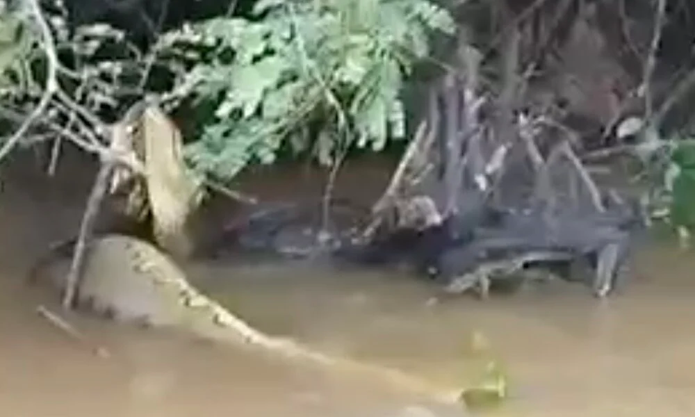 Os homens que filmam o animal de dentro de um barco se assustam com o tamanho da serpente, que tenta subir o barranco, mas volta para a água. “Olha o tamanho da miudinha aí. Meu amigo, é um chicote”, diz um deles.