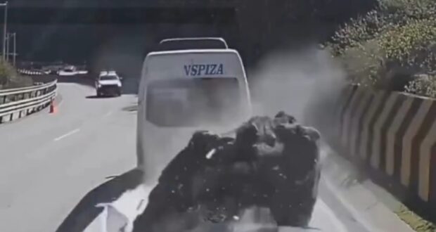 Na gravação, publicada nas redes sociais, são vistos em um primeiro momento dois veículos brancos, uma caminhonete e uma van, parados na estrada enquanto outros veículos se deslocavam no sentido contrário. Mas depois disso, uma pedra gigante cai do morro em alta velocidade e atinge a cabine do caminhão. Com o impacto, o carro ficou completamente destruído e depois capotou.