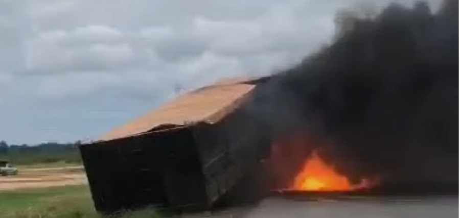 Carreta tem carroceria destruída por incêndio próximo a Sena Madureira; ASSISTA