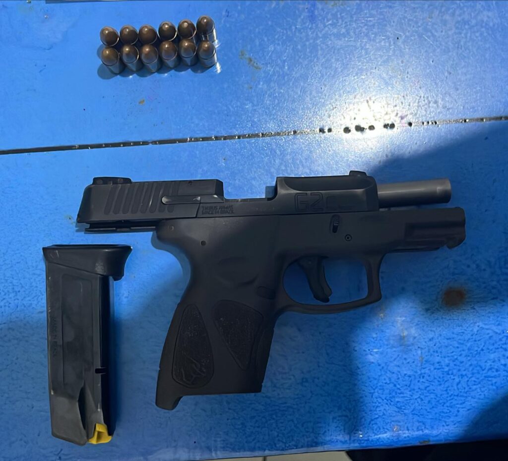 Durante a abordagem, foi constatado que o senhor M.J.M. estava em posse de uma pistola da marca Taurus, modelo G2C, calibre 9 milímetros, carregada com 12 munições intactas. Questionado pelos policiais, o homem afirmou que a arma estava registrada em seu nome para posse, porém com permissão restrita apenas ao interior de sua residência.