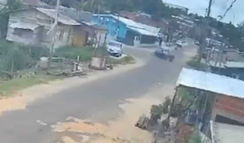 A motocicleta, que tinha o suporte de ‘carrocinha’ na parte traseira, acabou colidindo frontal ao veículo. Câmeras de segurança registraram o momento.
