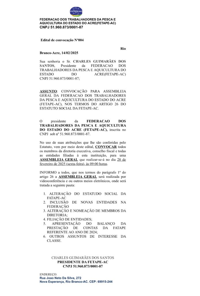 CONVOCAÇÃO: FEDERACAO DOS TRABALHADORES DA PESCA E AQUICULTURA DO ESTADO DO ACRE(FETAPE-AC)