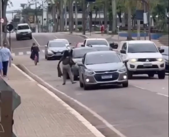 Na gravação, é possível observar a mulher no meio da avenida atacando os veículos que tentavam desviar dela, enquanto as pessoas ao redor comentavam sobre a situação.