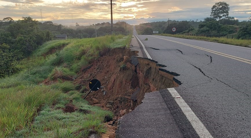 Pelas imagens é possível perceber que parte do asfalto já foi afetado e rachaduras já afetam grande parte da rodovia que dá acesso ao segundo maior município do Acre, Cruzeiro do Sul.