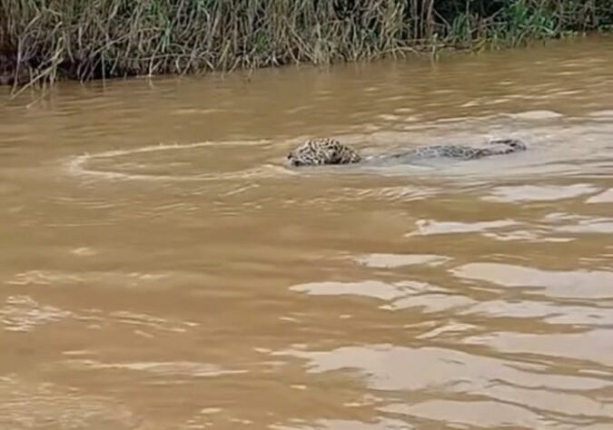 Ele registrou em vídeo o momento em que uma onça-pintada atravessa o rio nadando nas águas da região. No início da gravação, o pescador expressa seu encantamento com a cena, dizendo: “Tô tendo esse privilégio aqui”.