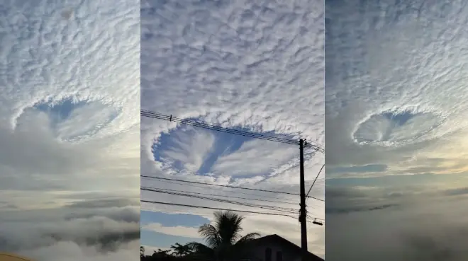 O professor de Geografia Fábio Cervezão explica que o evento pode estar ligado à formação de baixa pressão na atmosfera. “Esse tipo de nuvem é conhecido como altocúmulo estratiforme, que não forma chuva. O que pode ter acontecido é uma corrente de ar vertical, que sobe, abrindo esse espaço no céu”, detalhou.