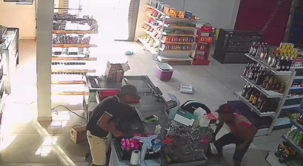 O crime foi registrado por câmeras de monitoramento, que flagraram o momento em que três criminosos armados invadiram o estabelecimento comercial e surpreenderam uma pessoa presente no local com um ‘mata-leão’.