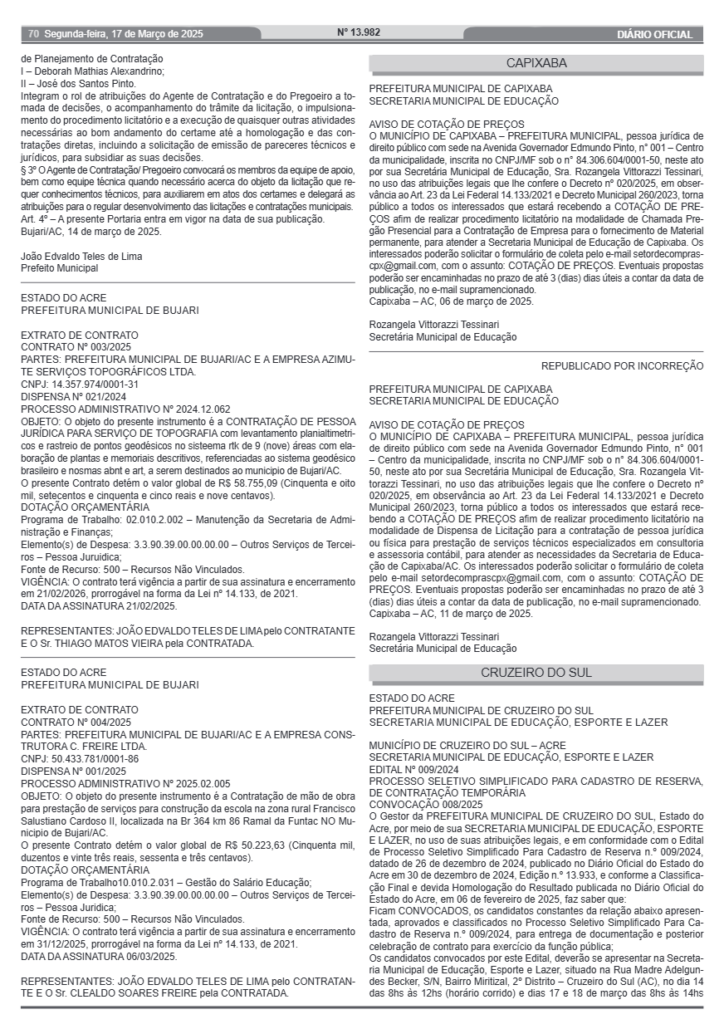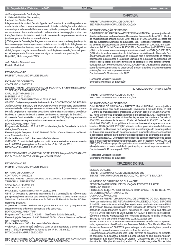 A Prefeitura de Cruzeiro do Sul, por meio da Secretaria Municipal de Educação, Esporte e Lazer, divulgou nesta segunda-feira, 17, a convocação nº 008/2025 referente ao processo seletivo simplificado para cadastro de reserva.