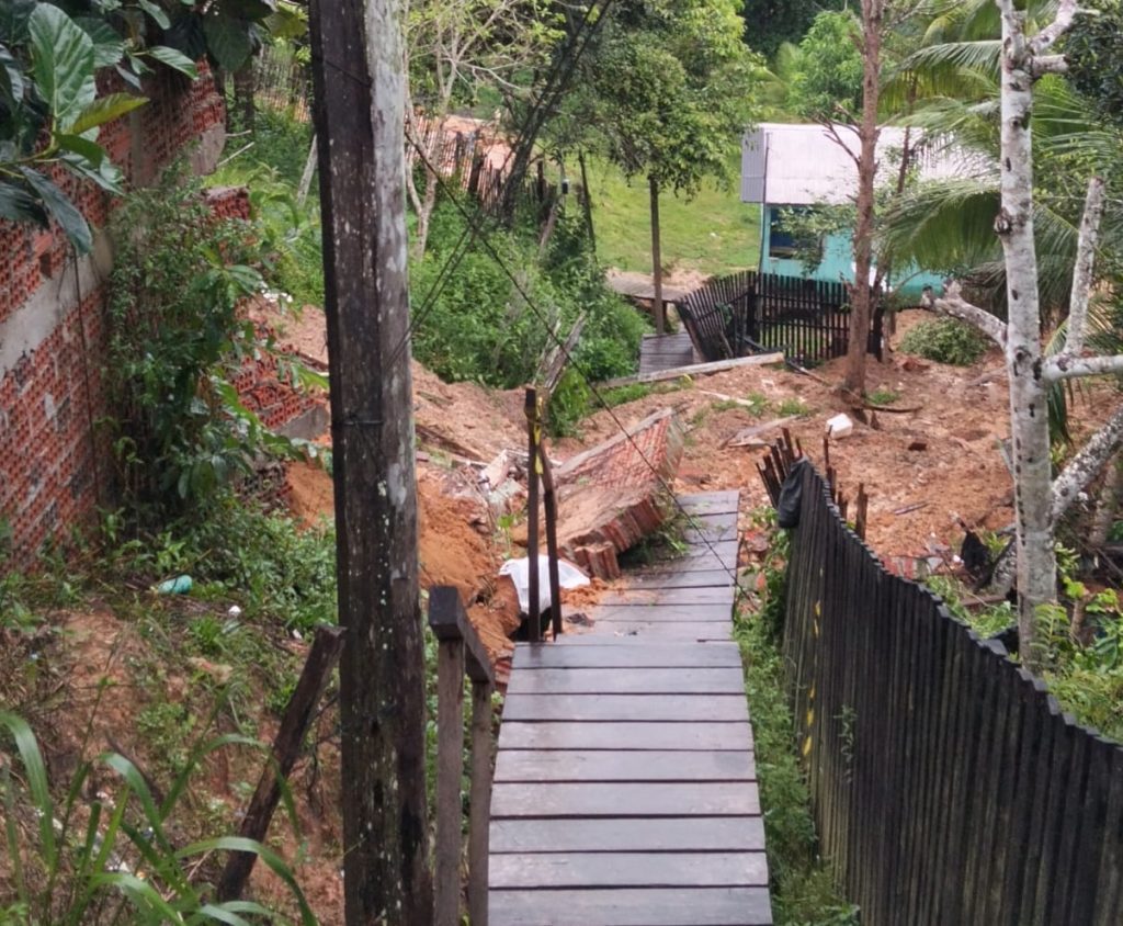 “Ontem, por volta de 1h15, uma barreira aqui do meu quintal caiu pela primeira vez. Aí já prejudicou a ponte que passa do lado, que é acesso do pessoal que mora pra baixo na Rua Iaco. Por volta de 1h40, a segunda barreira foi pior ainda. Quase prejudica a minha casa, que eu tinha acabado de construir. Quebrou o muro atrás e levou lama até a casa de uma vizinha lá embaixo”, relatou Magna.