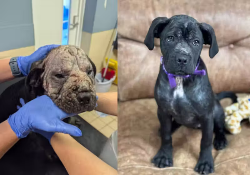 Filhote abandonada com problema grave de pele é tratada, fica linda e vai ser adotada