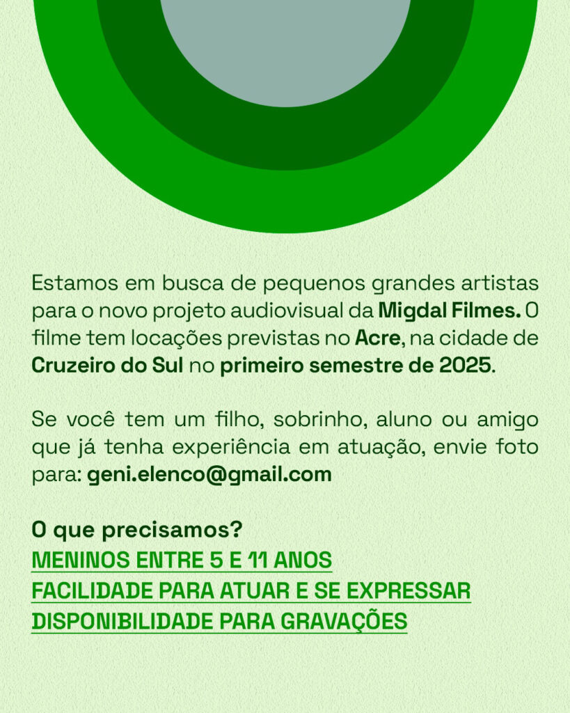 A cidade de Cruzeiro do Sul, no Acre, será cenário para as gravações do filme “Geni e o Zepelim”, nova produção da Migdal Filmes, com filmagens previstas para o primeiro semestre de 2025. Para compor o elenco, a produção está em busca de meninos entre 5 e 11 anos que tenham aptidão para atuação e disponibilidade para as gravações.
