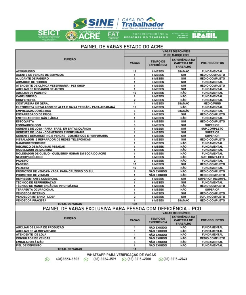 O Sistema Nacional de Emprego do Acre (Sine) disponibiliza 113 vagas de trabalho nesta segunda-feira, 31. As oportunidades são para candidatos com ensino fundamental e médio, sendo 11 delas exclusivas para pessoas com deficiência.