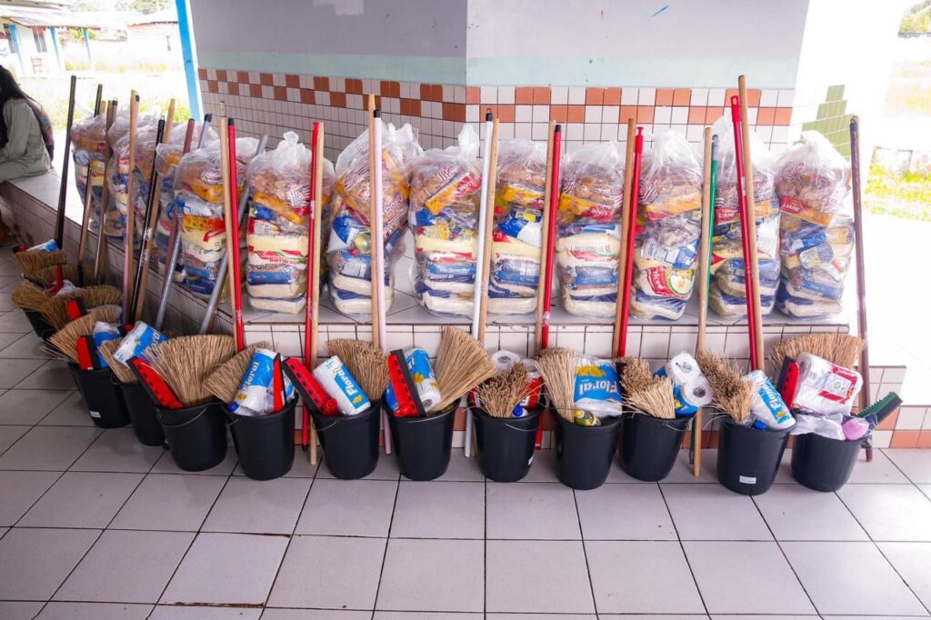 “Hoje nós já estamos aqui entregando para elas os kits de limpeza, uma cesta básica que dá para elas se alimentarem durante um mês. Todos os produtos são de 5 ou 4 quilos de cada, bolacha conserva, o leite, os flocos de milho, é uma cesta bem recheada”, relata.