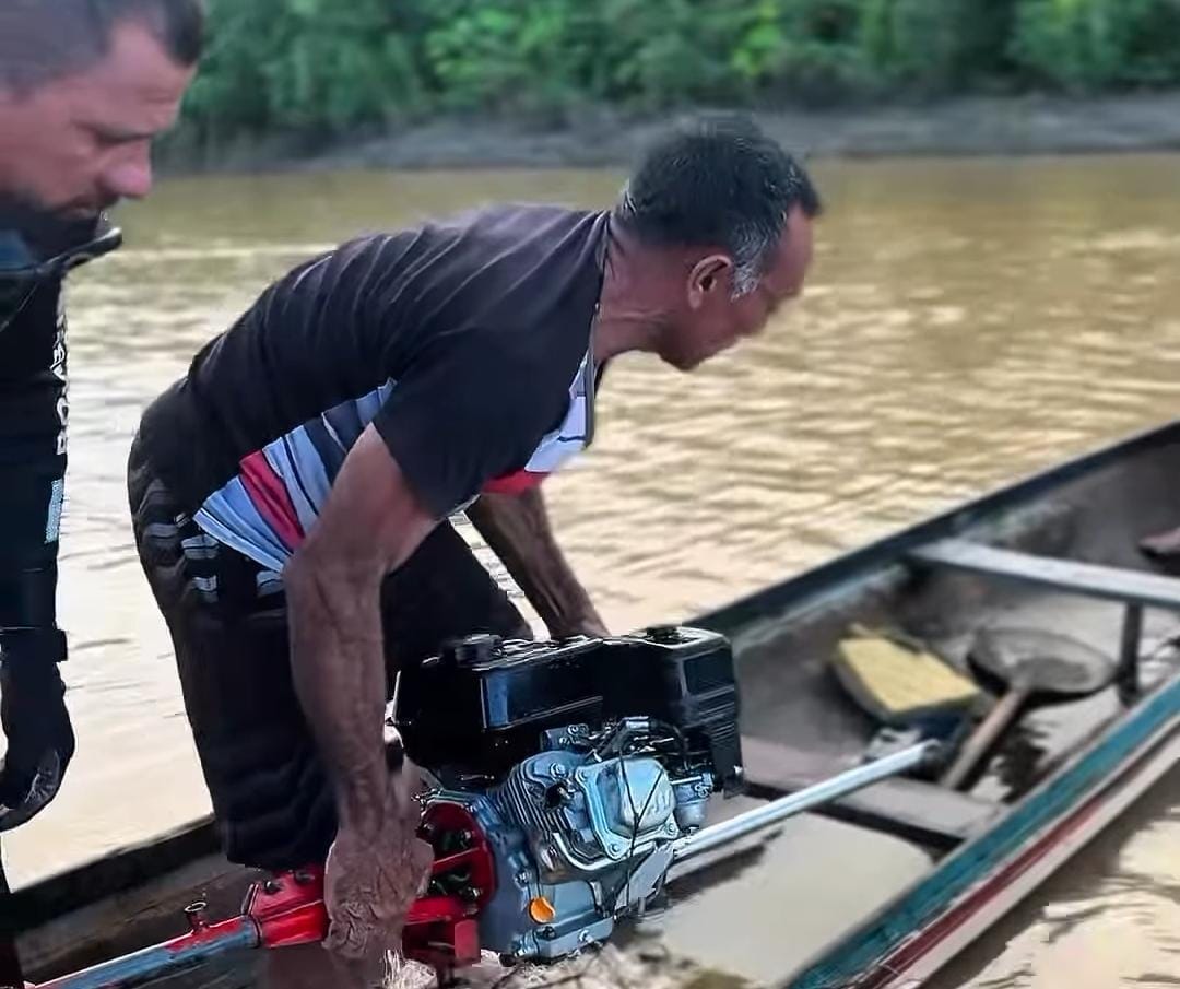A equipe realizou diversas tentativas até conseguir localizar e recuperar o motor submerso com segurança. O equipamento foi então entregue ao proprietário, que acompanhou toda a ação no local.
