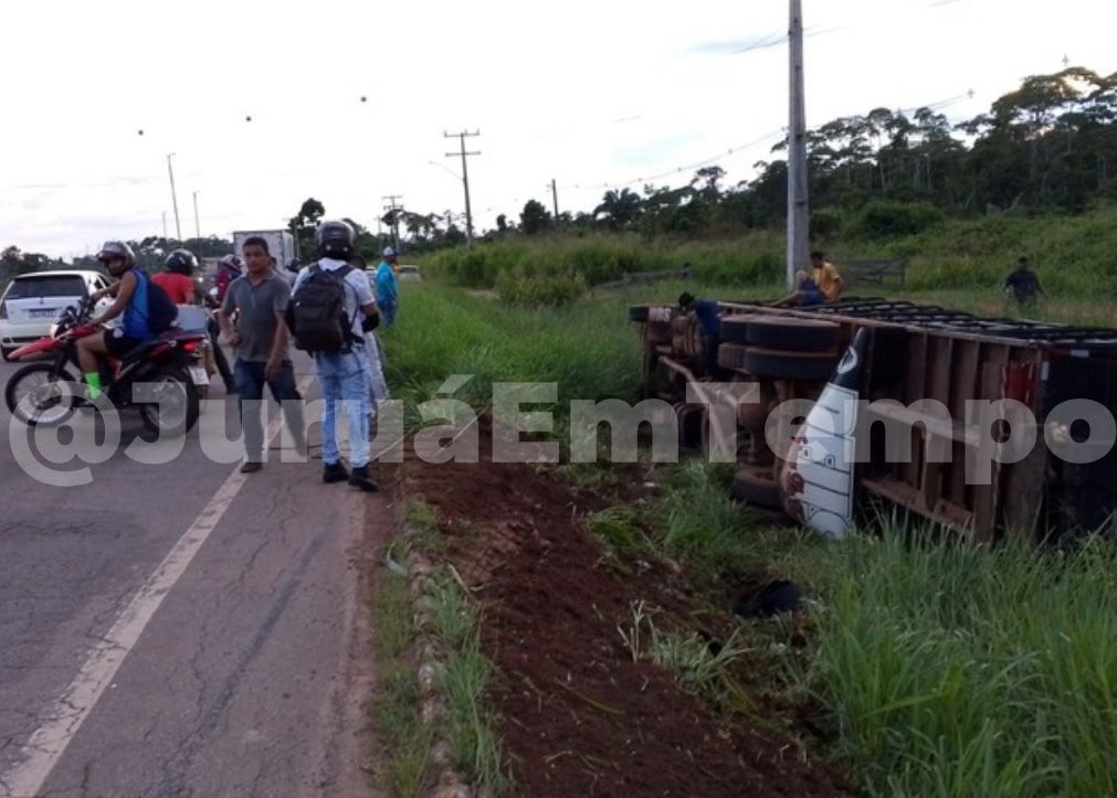 Um caminhão boiadeiro tombou no fim da tarde desta segunda-feira (21) em um trecho da BR-364, na Via Verde, em Rio Branco, nas imediações da Terceira Ponte. O acidente aconteceu após o motorista tentar desviar de outro veículo que realizava uma ultrapassagem perigosa.