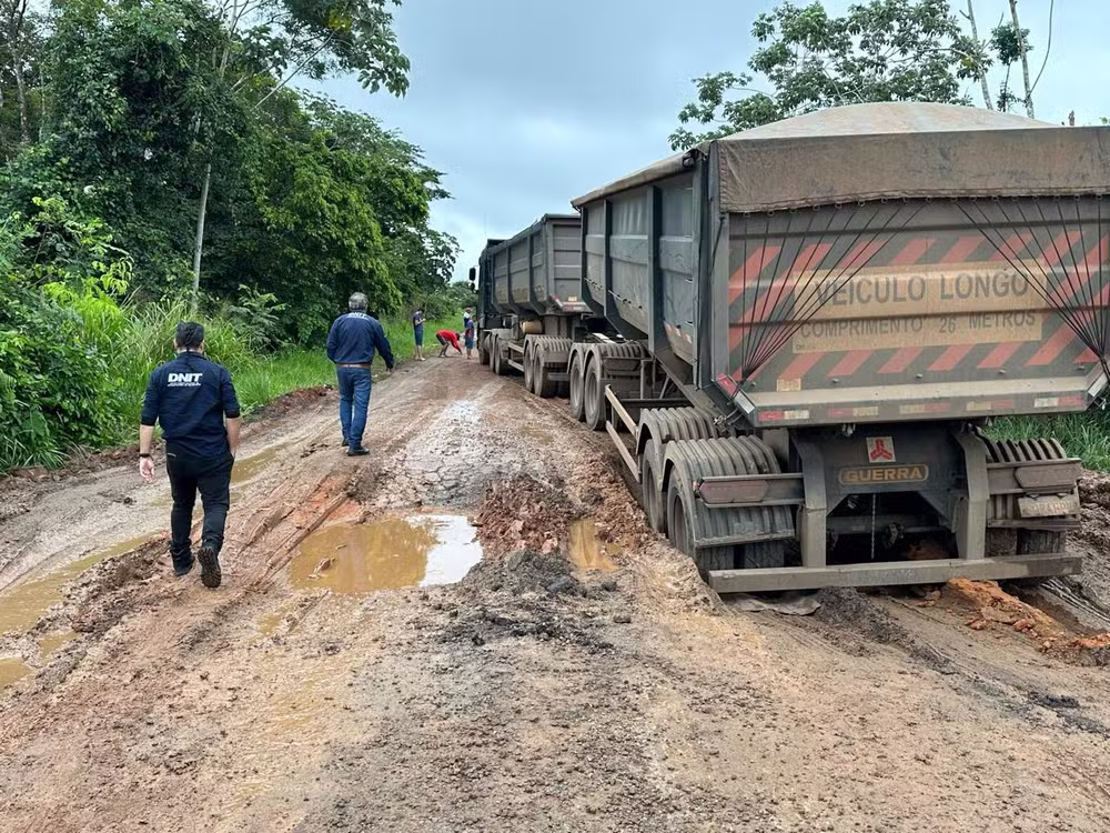 Imagens gravadas por motoristas mostram caminhões, ônibus intermunicipais, caçambas e carretas paradas no trecho praticamente sem pavimentação. Com a chuva, o lamaçal tomou a passagem e os motoristas interromperam a viagem para não ficar presos.