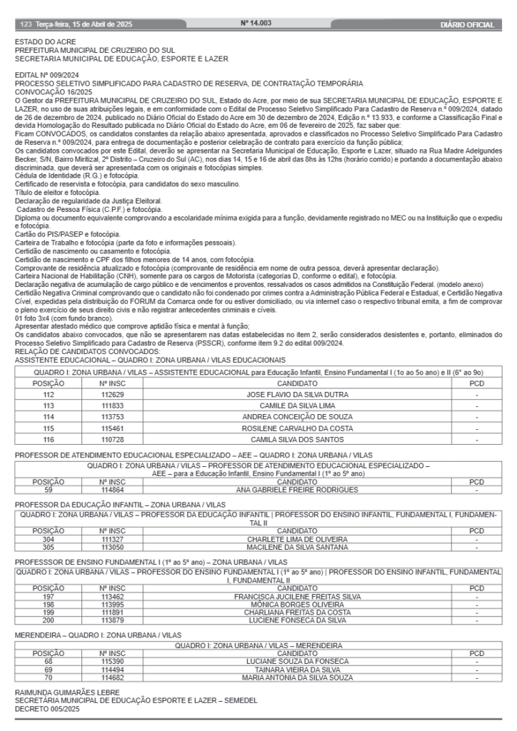 A Prefeitura de Cruzeiro do Sul, por meio da Secretaria Municipal de Educação, Esporte e Lazer, publicou nesta terça-feira, 15, a 16ª convocação dos candidatos aprovados no processo seletivo simplificado nº 009/2024, destinado à formação de cadastro de reserva para contratações temporárias.