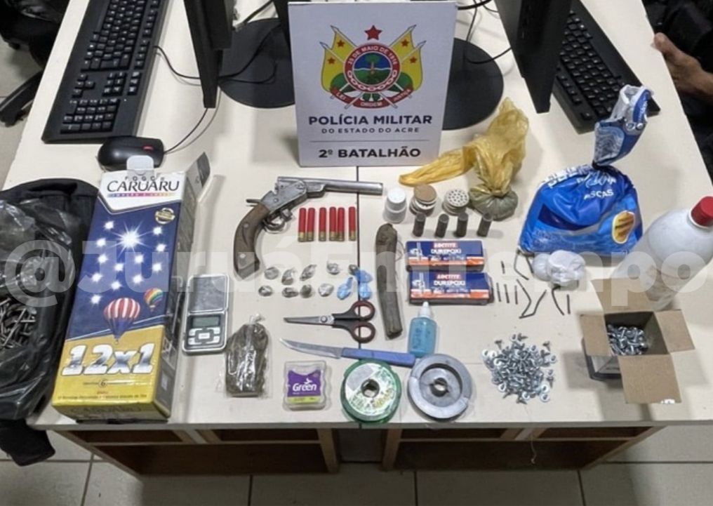 Em uma ação realizada na noite do último domingo (20), a Polícia Militar do Acre prendeu um foragido da Justiça que estava em posse de drogas, uma arma de fogo e itens utilizados na fabricação de explosivos artesanais. O flagrante aconteceu na rua Próspero Liberdade, no Conjunto Habitacional Cidade do Povo, situado no segundo distrito de Rio Branco.