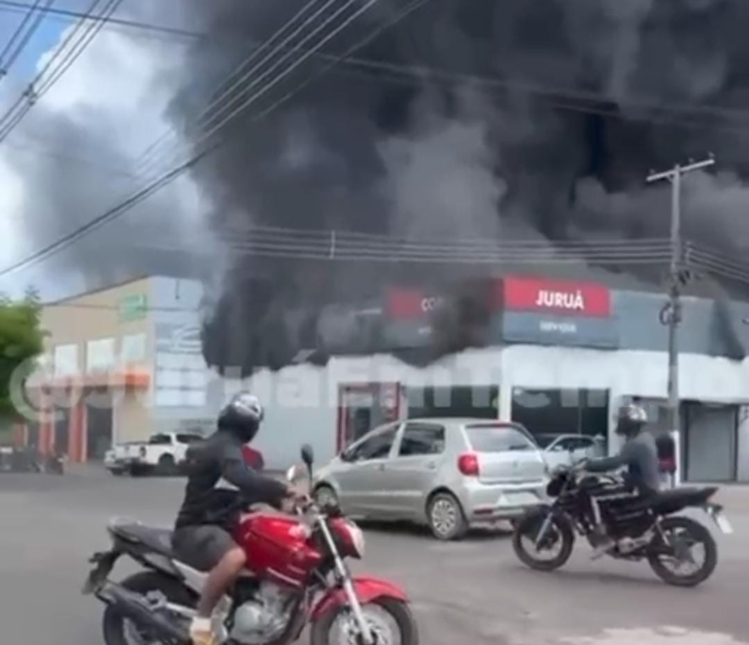 Um incêndio de grandes proporções atingiu, na tarde desta terça-feira (8), dois estabelecimentos comerciais localizados no bairro AABB, em Cruzeiro do Sul. As chamas teriam começado na oficina da revendedora Fiat Comauto e, devido à proximidade dos prédios, rapidamente se espalharam para o Super Centro Automotivo, loja vizinha.