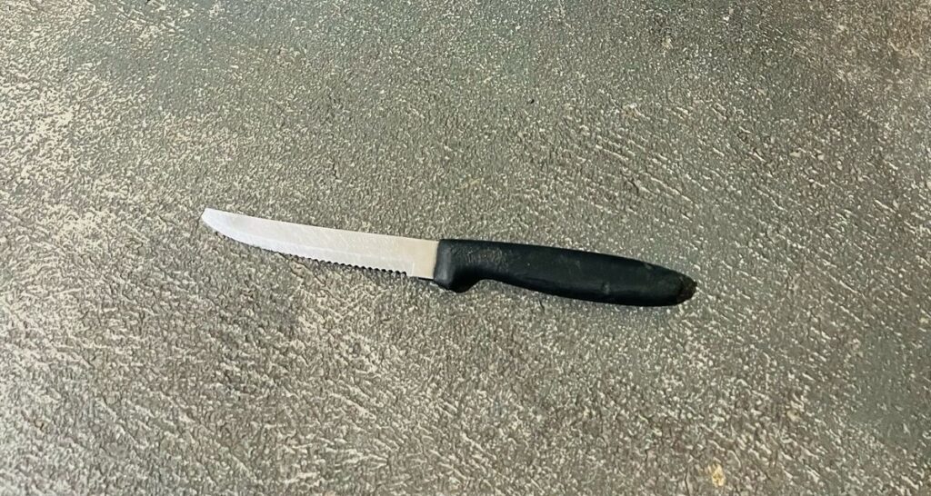 A denúncia foi repassada em tempo real ao COPOM, que prontamente acionou uma equipe da guarnição para averiguar os fatos. Ao chegar ao local, os policiais visualizaram o indivíduo ainda no estabelecimento, portando um instrumento perfurocortante semelhante ao utilizado para cortar fios de cobre. A abordagem foi realizada imediatamente, confirmando a materialidade do delito.