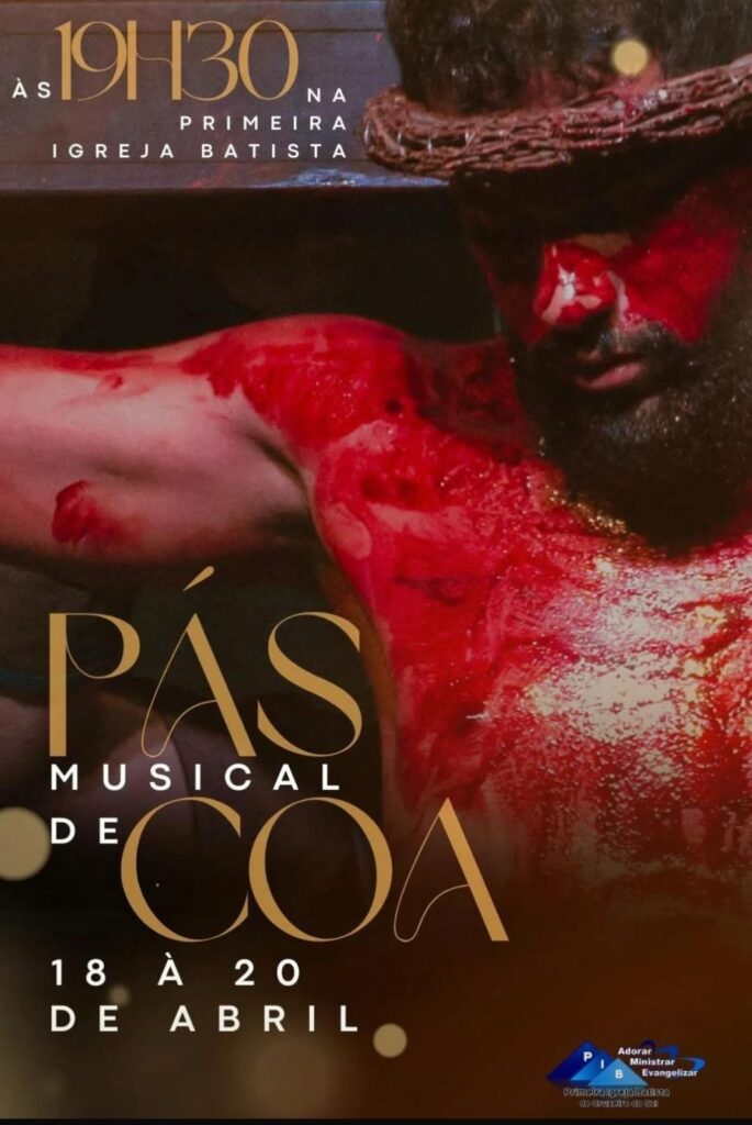 A Primeira Igreja Batista de Cruzeiro do Sul promoverá, entre os dias 18 e 20 de abril, um emocionante musical de Páscoa, com início às 19h30, em sua sede localizada na Rua Siqueira Campos, nº 158, no Centro da cidade. A entrada é gratuita.