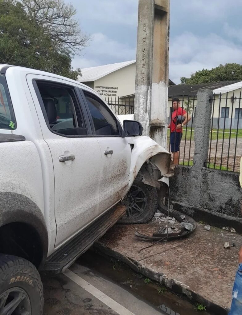Na manhã deste sábado (3), um acidente de trânsito foi registrado na Avenida 25 de Agosto, no bairro Aeroporto Velho, em Cruzeiro do Sul, próximo à Igreja de Nossa Senhora Aparecida. O condutor de uma Ford Ranger perdeu o controle do veículo ao contornar a rotatória e colidiu contra um poste de energia elétrica.