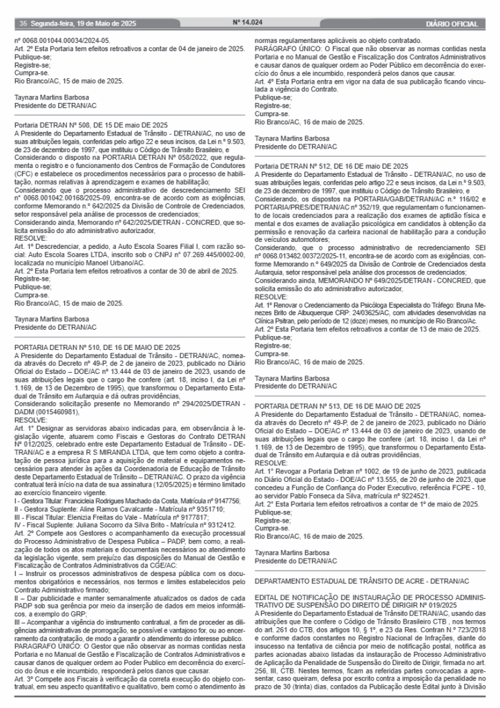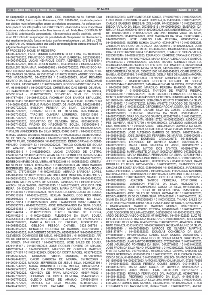 O Departamento Estadual de Trânsito do Acre (Detran/AC) notificou, por meio de edital publicado no Diário Oficial do Estado (DOE) desta segunda-feira, 19, a instauração de processo administrativo que pode resultar na suspensão do direito de dirigir de diversos condutores.