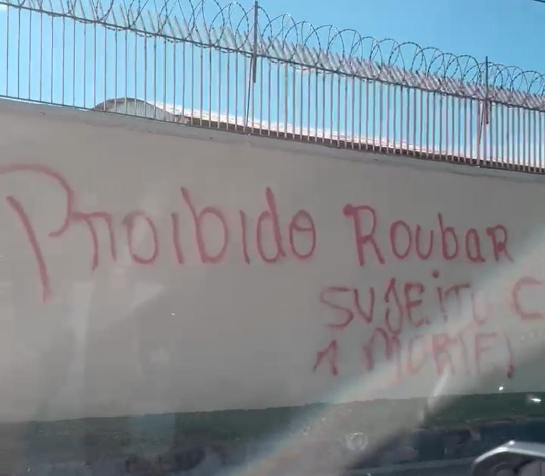 “Proibido roubar. Cuide de não roubar. Sujeito à morte”, diz as pichações no muro.