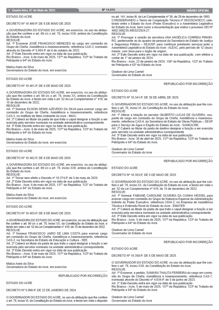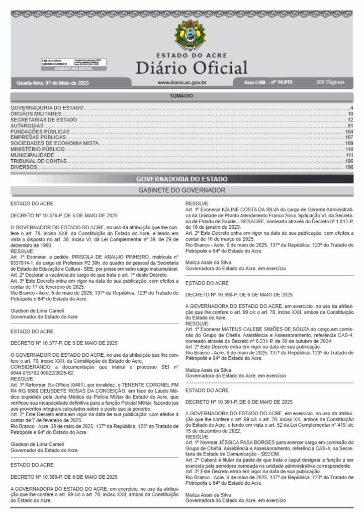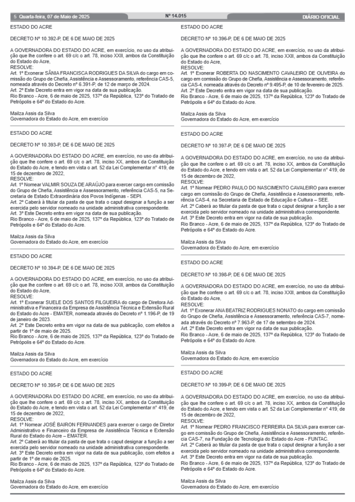 A governadora do Acre, em exercício, Mailza Assis (Progressistas), oficializou nesta quarta-feira, 7, no Diário Oficial do Estado (DOE) mudanças no quadro de servidores estaduais. As alterações incluem exonerações, nomeações e a reforma de cargos comissionados.