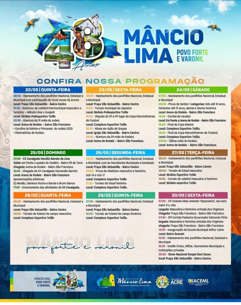 O município de Mâncio Lima, no interior do Acre, comemora 48 anos de emancipação política com uma programação que acontece entre os dias 22 e 30 de maio. As atividades incluem competições esportivas, rodeios, cavalgada, apresentações culturais, ações educativas e religiosas.