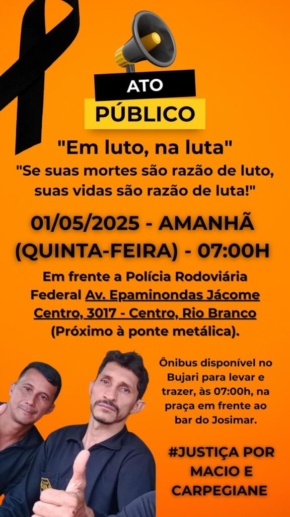 Na manhã desta quinta-feira, 1º de maio de 2025, Dia do Trabalhador, familiares, amigos e apoiadores dos jovens Macio Pinheiro e Carpegiane realizarão um ato público em memória dos dois, que morreram em circunstâncias ainda não esclarecidas. Intitulado “Em luto, na luta”, o protesto será realizado a partir das 7h, em frente à sede da Polícia Rodoviária Federal (PRF), na Avenida Epaminondas Jácome, no centro da cidade.