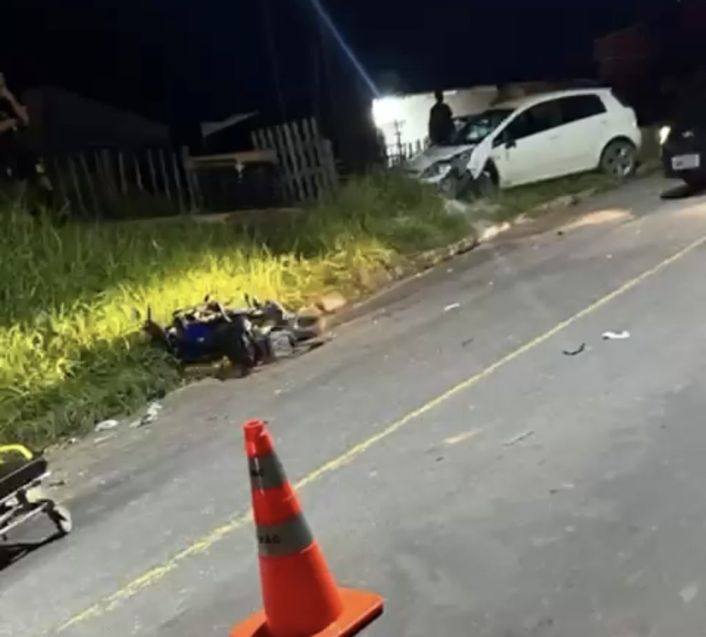 O carro envolvido no acidente teve danos visíveis na parte dianteira, especialmente em uma das rodas. A motocicleta, por sua vez, ficou bastante danificada devido à força da colisão.