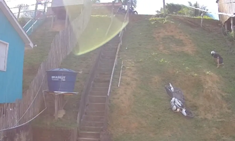 Na tarde desta segunda-feira, 26, um motociclista perdeu o controle e caiu em um barranco de mais de 10 metros de altura no bairro Manoel Terças, em Cruzeiro do Sul. Em imagens captadas por uma câmera de segurança é possível ver o momento da queda.
