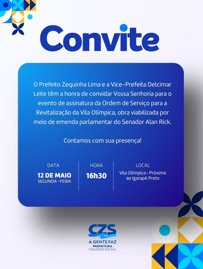 A Prefeitura de Cruzeiro do Sul vai revitalizar a Vila Olímpica, que fica nas proximidades do Igarapé Preto. O prefeito Zequinha Lima vai assinar a Ordem de Serviço da obra no próprio local,às 16h30. A iniciativa é resultado de uma emenda parlamentar de R$ 480 mil destinada pelo Senador Alan Rick.