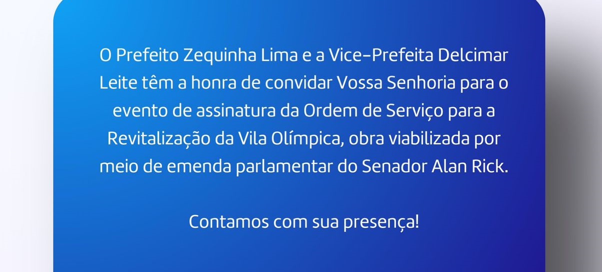 A Prefeitura de Cruzeiro do Sul vai revitalizar a Vila Olímpica, que fica nas proximidades do Igarapé Preto. O prefeito Zequinha Lima vai assinar a Ordem de Serviço da obra no próprio local,às 16h30. A iniciativa é resultado de uma emenda parlamentar de R$ 480 mil destinada pelo Senador Alan Rick.
