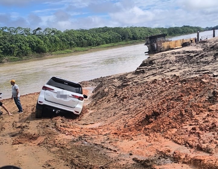 De acordo com imagens registradas por populares, um SUV branco ficou preso na lama próximo à margem do rio. Outro veículo branco enfrentou problemas ao sair da balsa, precisando do auxílio de dois homens para conseguir desatolar. As chuvas e a pista sem qualquer pavimentação contribuem constantemente para incidentes como esse.