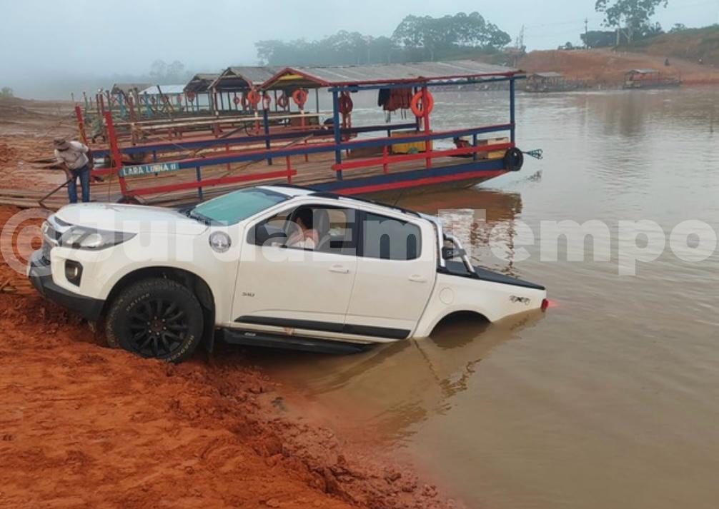 De acordo com informações, a balsinha já havia encostado para o desembarque, mas no momento em que a motorista tentou sair, acelerando veículo, a força fez com que a balsa se afastasse, e a caminhonete acabou ficando com a parte traseira submersa na água e a dianteira sobre o solo.