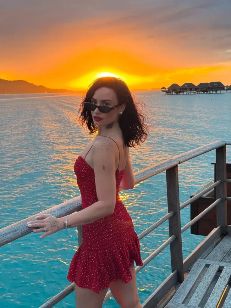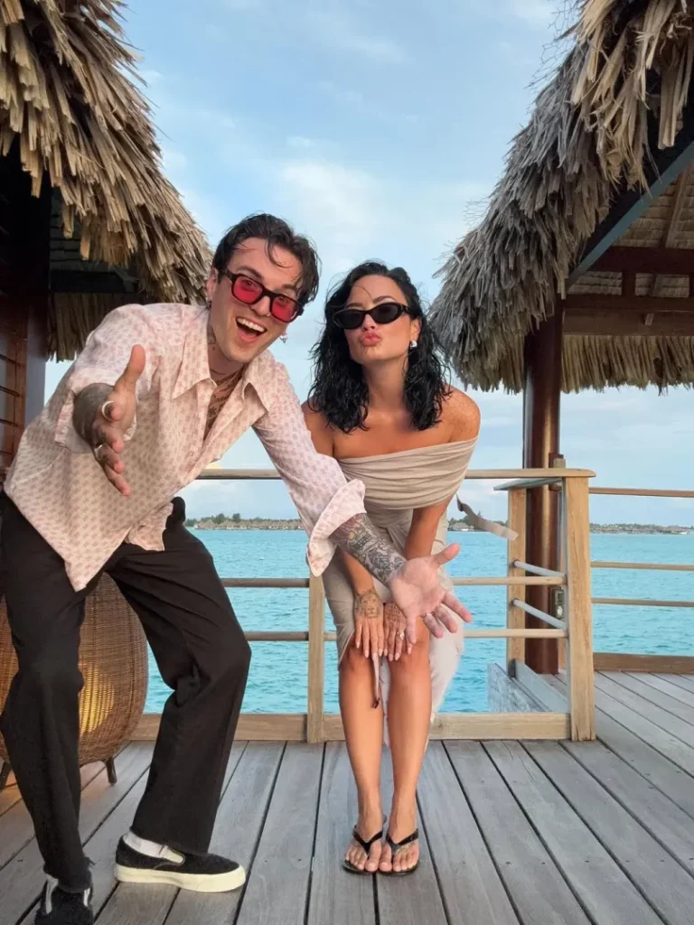 Nas redes sociais, a cantora compartilhou com os fãs uma série de fotos dos momentos a dois. Nas imagens, Demi aparece de biquíni, tomando sol e mergulhando no mar ao lado do companheiro, celebrando a nova fase como recém-casados.