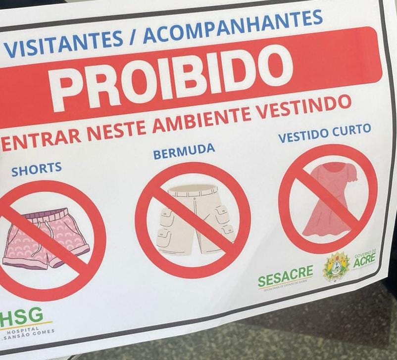 Um aviso fixado na entrada do Hospital Dr. Sansão Gomes, em Tarauacá, tem chamado a atenção de moradores e gerado discussões. O aviso informa que visitantes e acompanhantes estão proibidos de entrar na unidade de saúde usando shorts, bermudas ou vestidos curtos.
