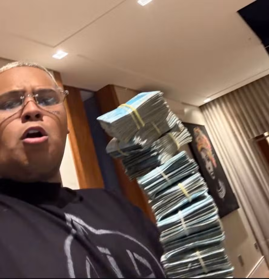 MC Ryan SP voltou a chamar atenção nas redes sociais ao surgir exibindo um bolo de notas de R$ 100 enquanto divulgava um site de apostas, os chamados “joguinhos de bet”. No vídeo, o funkeiro aparece com uma grande quantia em espécie. “Alguém quer um bolo aí?”, perguntou ele.
