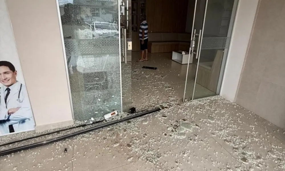Com o impacto, a porta de vidro da entrada do estabelecimento foi completamente destruída. Apesar do susto, até o momento não há informações sobre possíveis feridos.